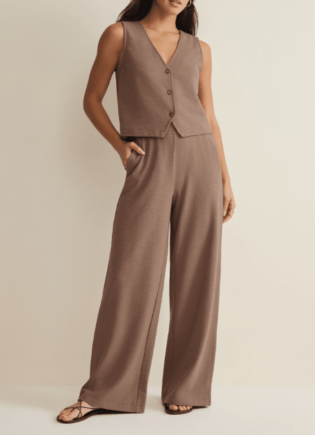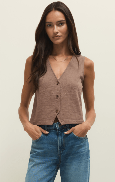 Detailed with a button front, v-neck, and lightweight textured knit fabric, this sleeveless top will be a forever staple in your wardrobe. Make it your go-to outfit with its matching pant or denim.