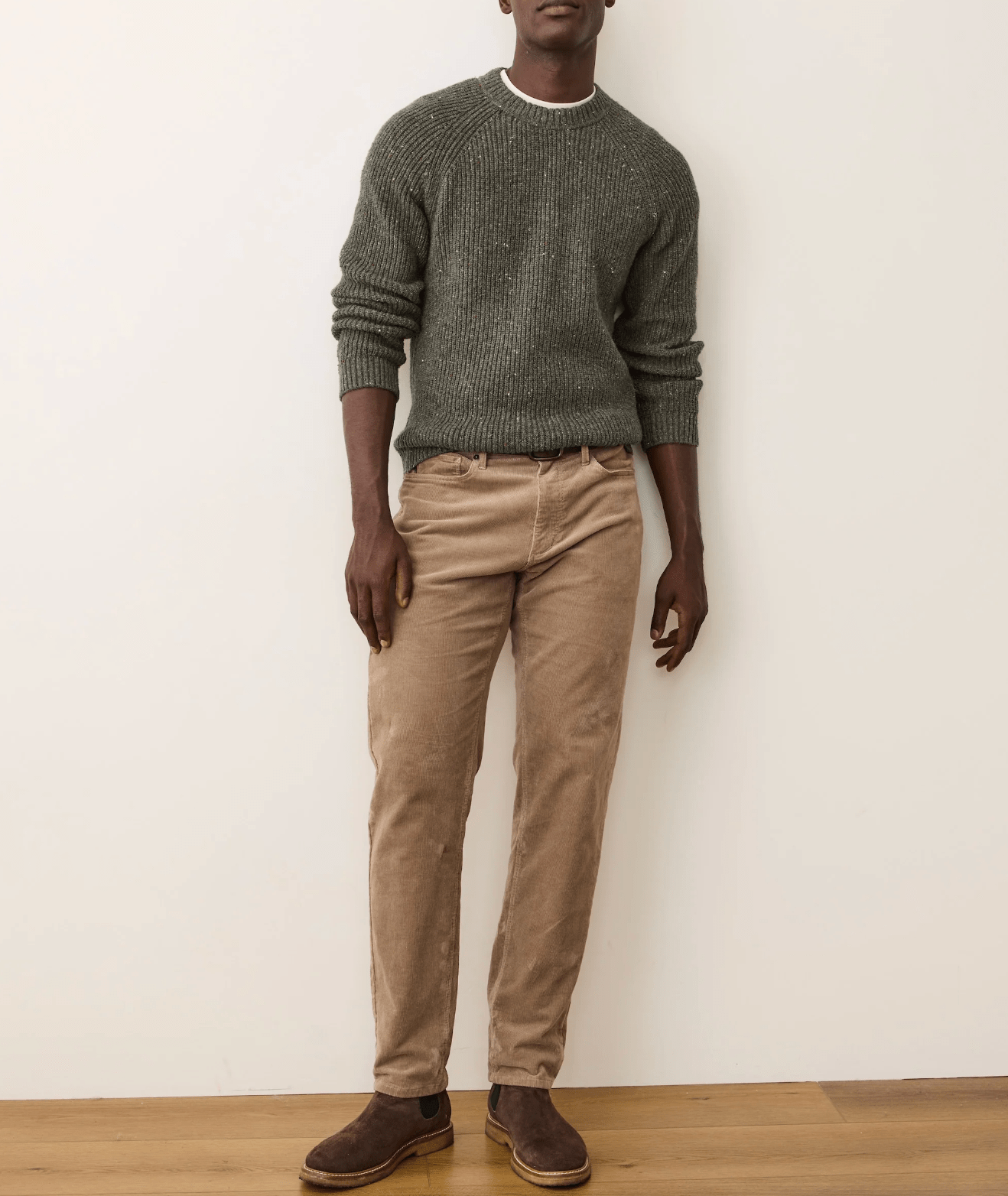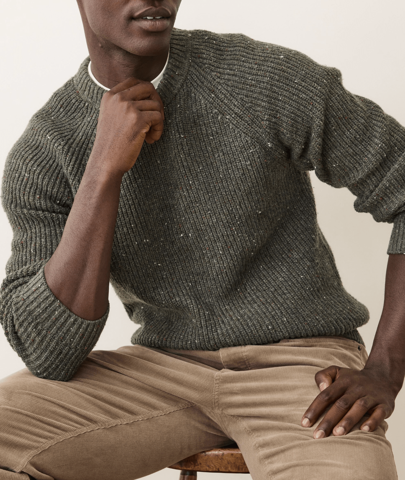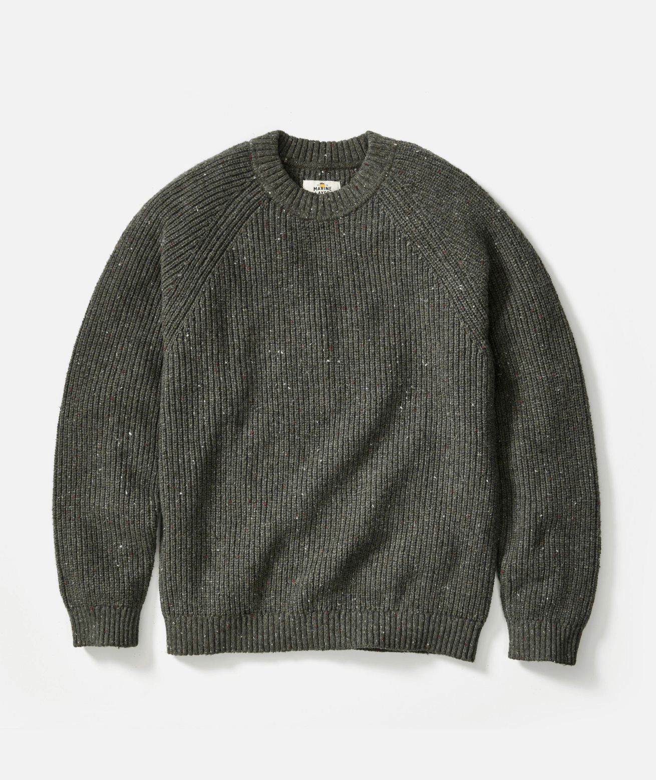 Marine Layer's Inverness sweaters are perfectly weighted, warm, and the ideal middle ground between a pattern and a solid. They get their unique look from a yarn that has bits of color twisted into the strands, giving the knit its signature visual texture.