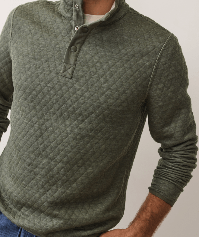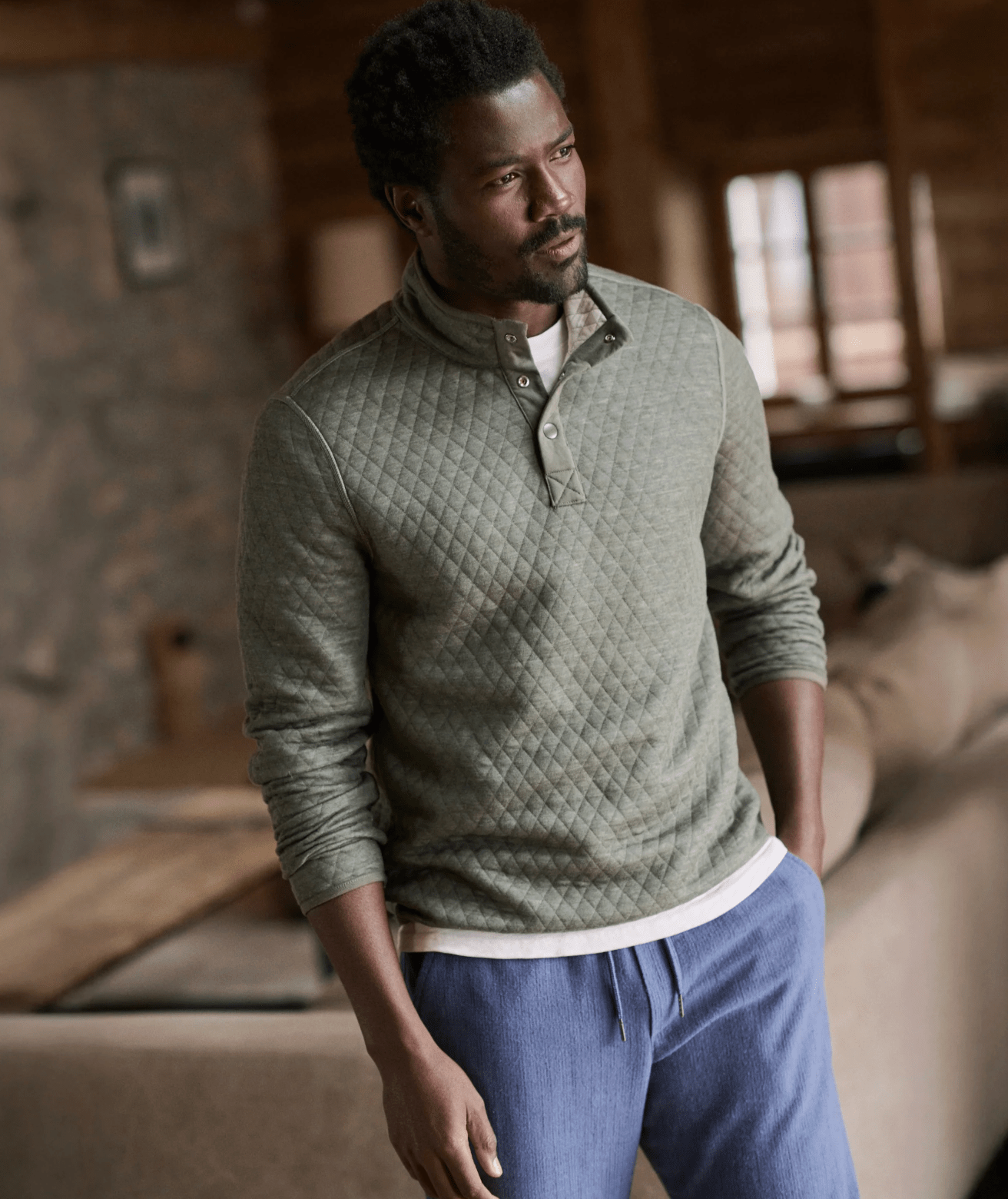 This pullover is made with the lighter weight version of Marine Layer's famous Corbet material so you can wear it indoors or out. It's two layers of fabric stitched together with a fill in between to give you added warmth and the signature quilted look.