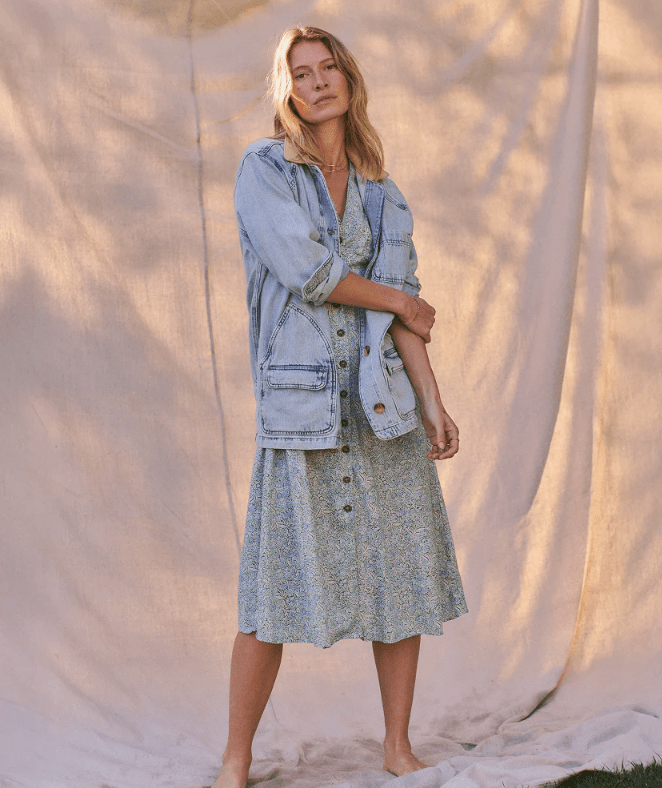 You know Marine Layer's bestselling Camila Mini Dress? This is her cool, older sister. With everything you love about Camila, now in a flattering midi length. It's got a ruffle sleeve, hook and eye closure (if you wanna cover up a little), and is smocked at the back for an extra flattering look.