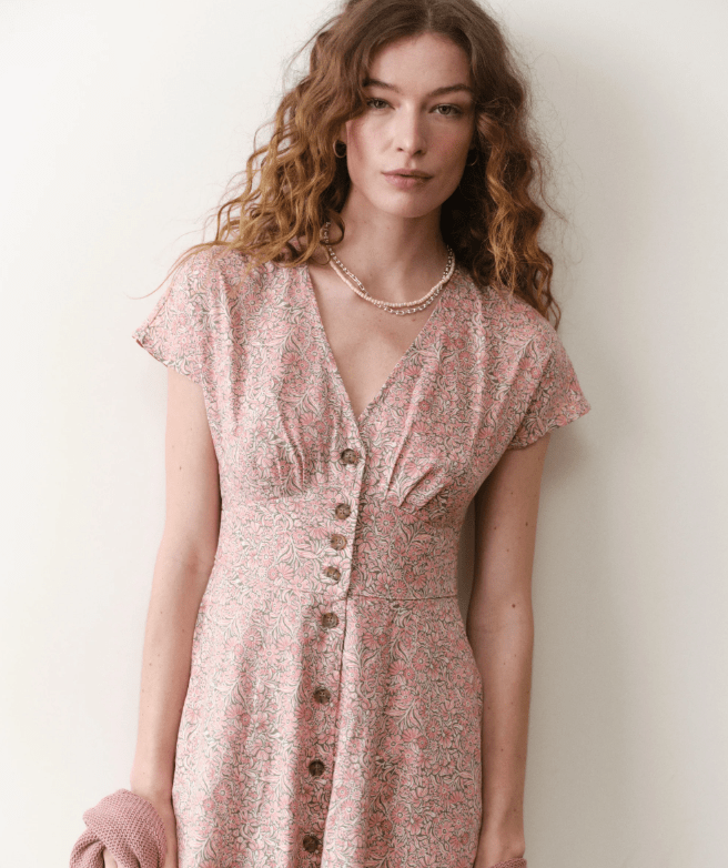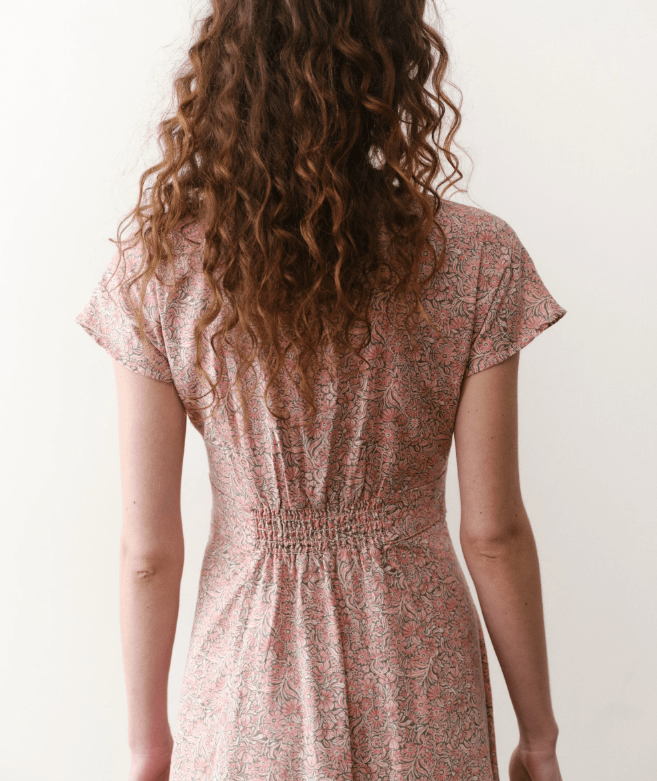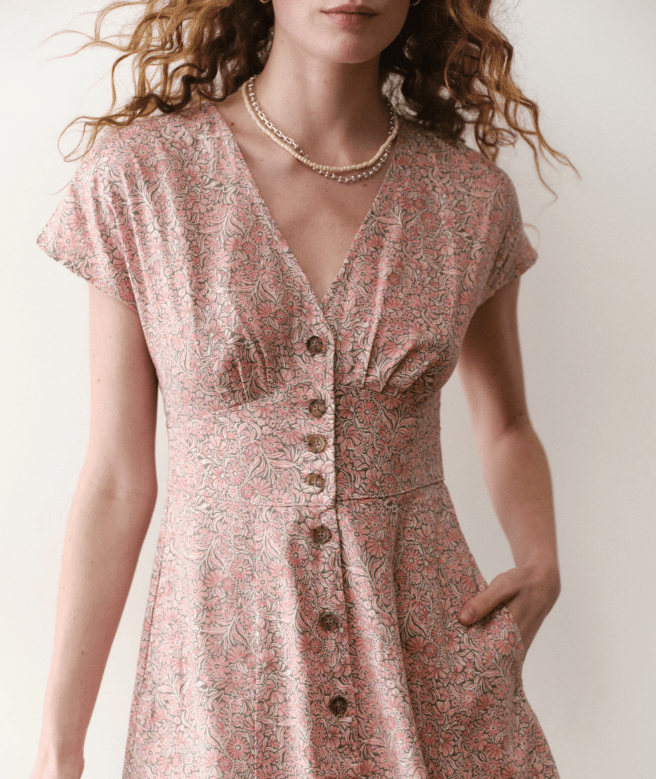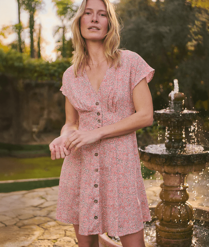This flutter-sleeve, A-line dress works for everything. Buttons up the front, pockets on the side, and eye closures (if you wanna cover up a little), and is smocked at the back for an extra flattering look.