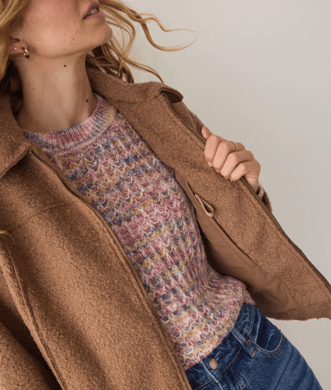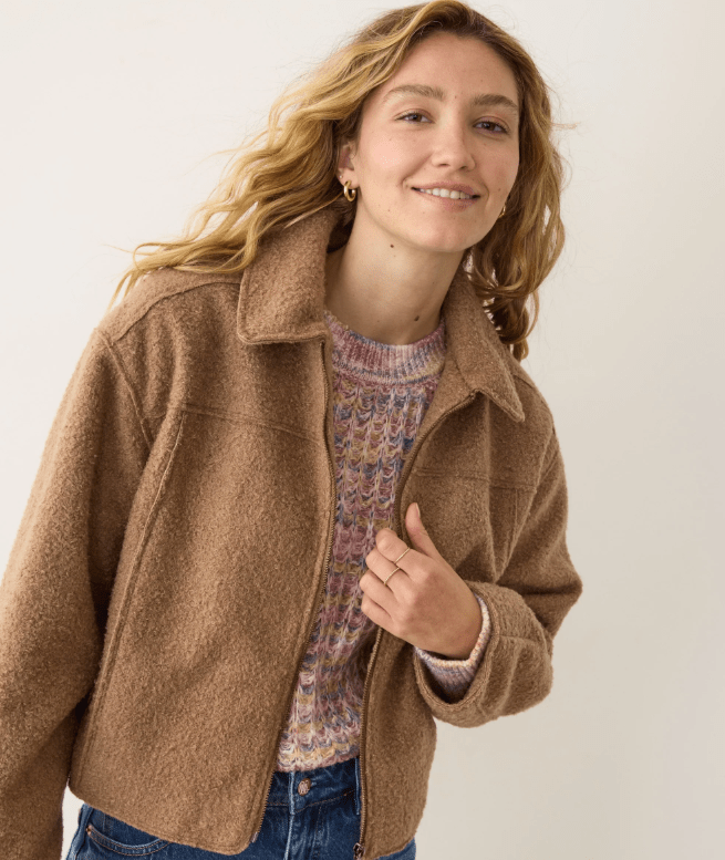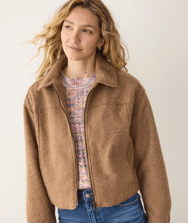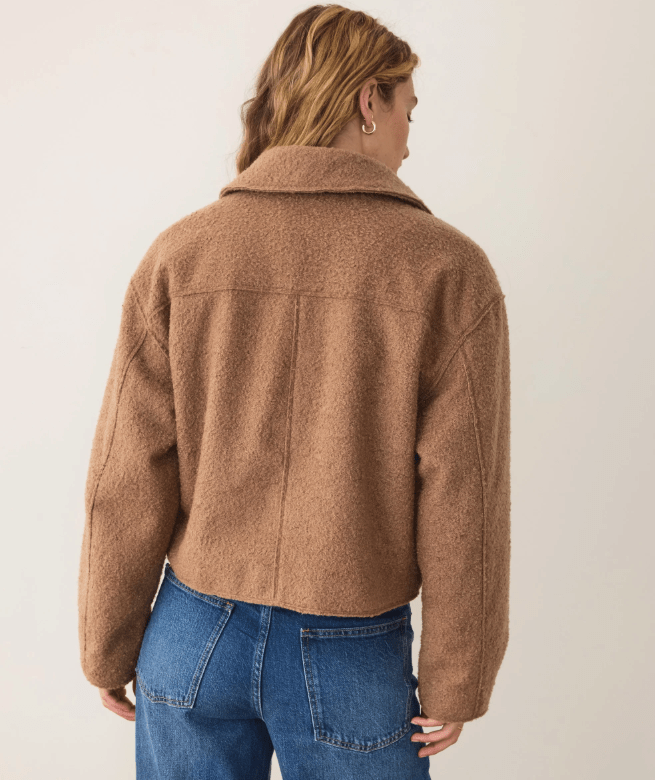 This jacket is the answer to being tired of every coat you own. The boucle fabric is fun but elegant, and also way softer than you'd think was possible. With a cute cropped fit, and the ridiculous comfort Marine Layer is known for, it's the perfect blend of looking your best but also feeling your best.